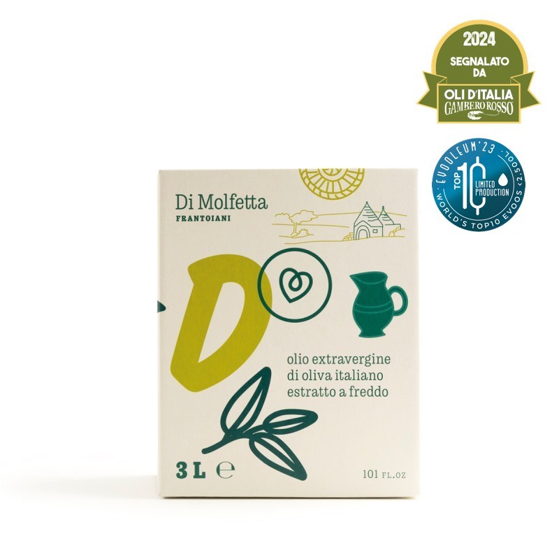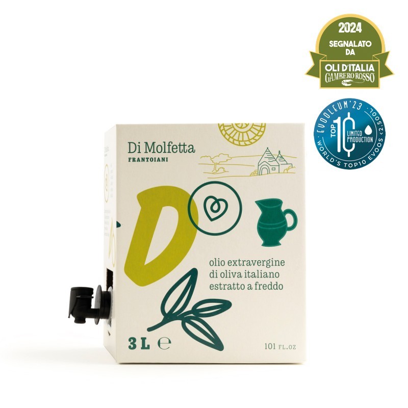 3 Litre Bag in Box of Delicate, light, 100% Italian extra virgin olive oil , cold-extracted from “Ogliarola”, “Peranzana” and “Coratina” olives.