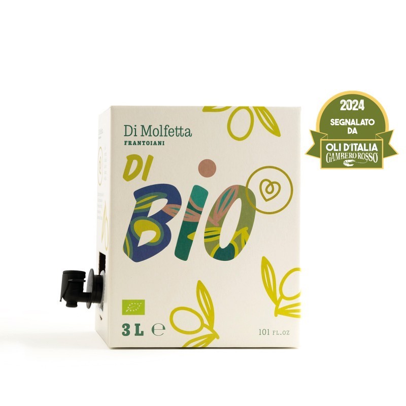 3-liter Bag-in-Box of Di Bio extra virgin olive oil obtained exclusively from the pressing of “Coratina” cultivar olives from controlled and certified organic farming.
