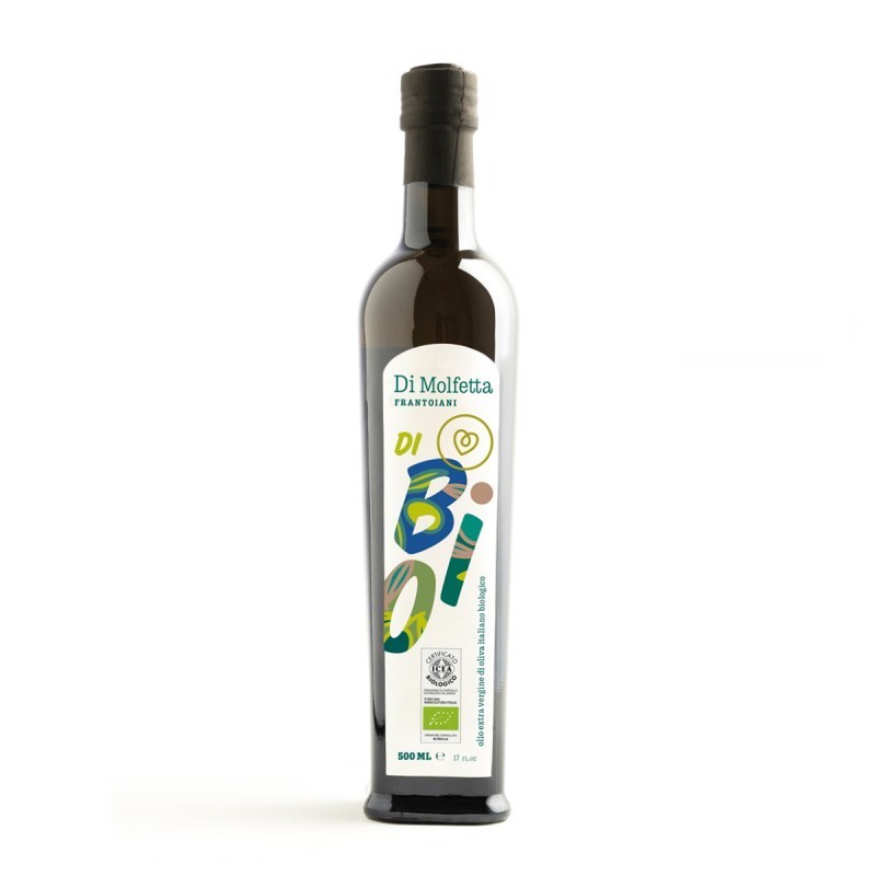 500ml bottle of Di Bio extra virgin olive oil obtained exclusively from the pressing of “Coratina” cultivar olives from controlled and certified organic farming.