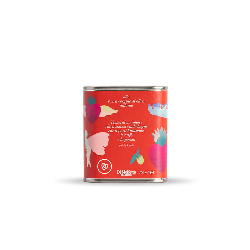 Three romantic 100ml cans containing 100% Apulian extra virgin olive oil from Molfetta Frantoiani