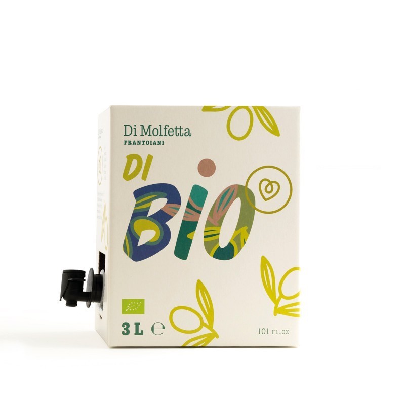 Bag in Box da 3 Litri di olio extra vergine di oliva Di Bio ottenuto esclusivamente dalla spremitura di olive di cultivar “Coratina” da agricoltura biologica controllata e certificata.